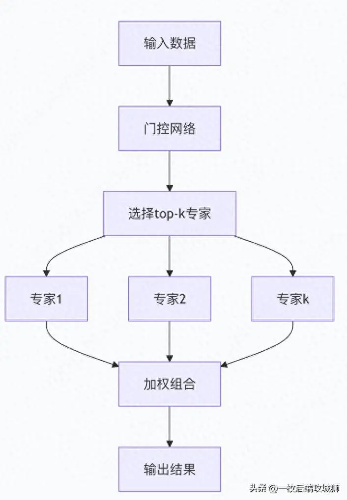 MoE是混合专家系统的缩写,是一种通过组合多个"专家"网络来构建更大模型的技术。每个专家都是相对较小的神经网络,而门控网络负责根据输入动态选择最相关的专家。