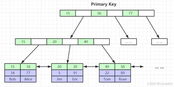 - B+树的叶子节点之间通过双向链表链接,方便进行范围查询。