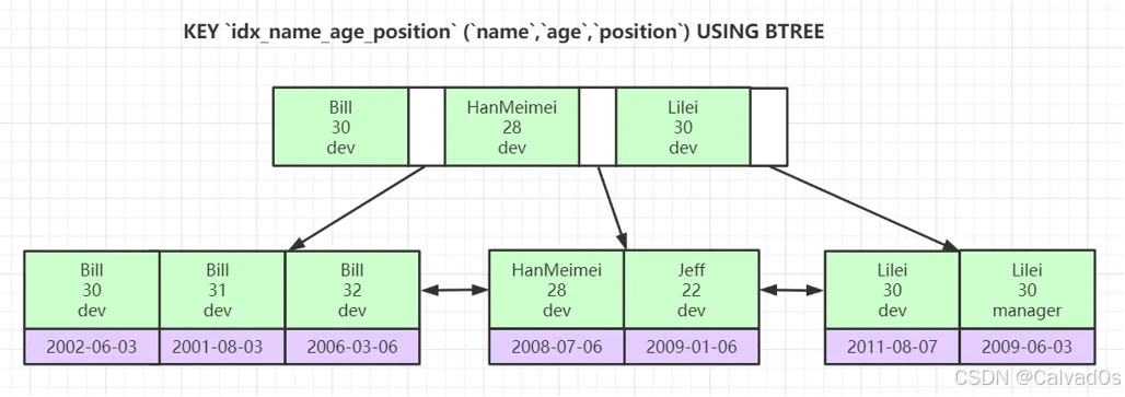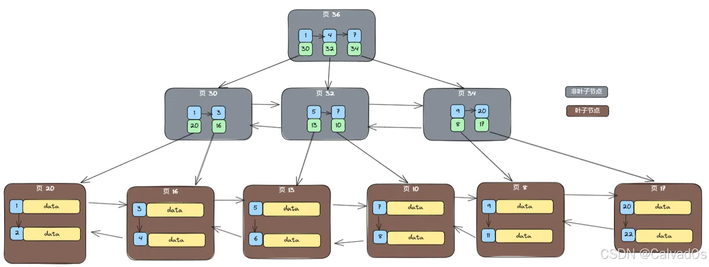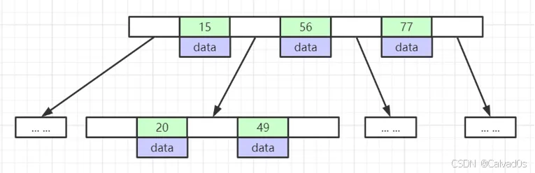 B树就是一个大的节点里面有很多小的K-V节点,放着我们的索引数据,不管是根节点还是叶子节点都有我们的data数据。