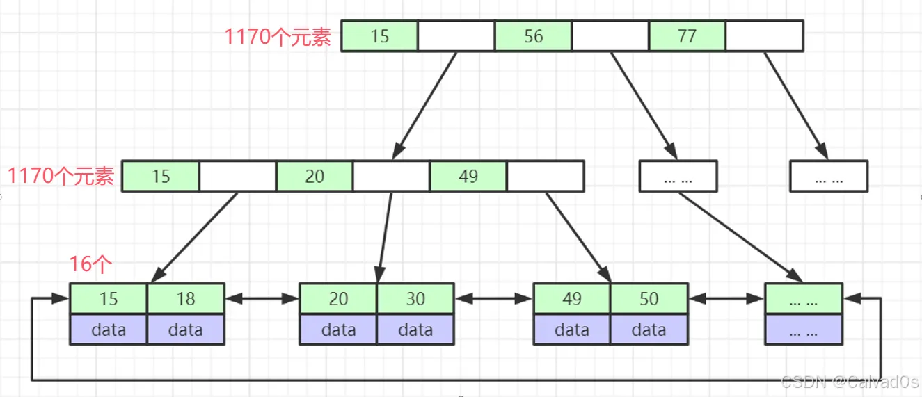 mysql中非叶子节点大约是16K大小,我们假如主键用bigint,大小为8字节,中间为下一个磁盘节点的文件地址,一般为6字节,那么16K大小能放多少个索引元素,16K/8b+6b为1170,那么就能放下1170个索引元素。