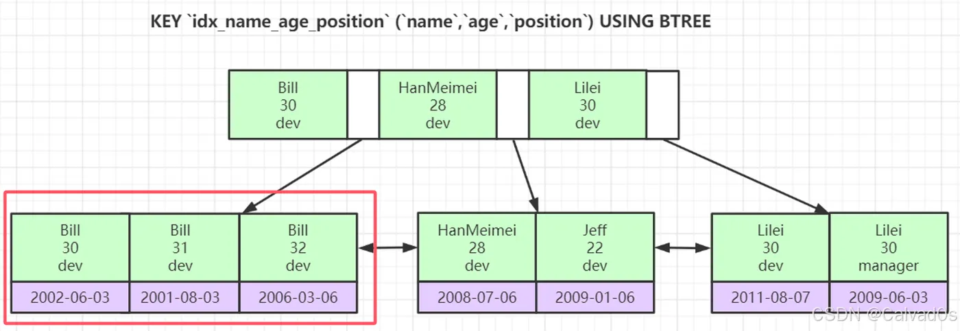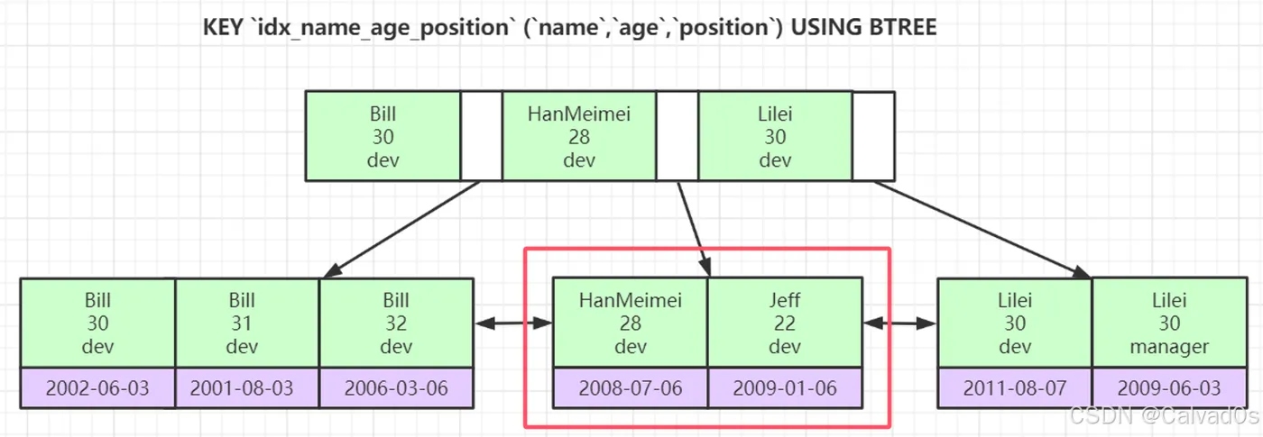 我们这里符合一个最左前缀法则,比如上图我们拿name、age、position来做联合索引,那么就会先比较name值,比如HanMeimei和Jeff值不同,那就能比较出大小了,那也就不用再继续比较age和position了。
