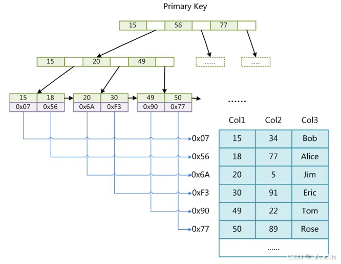 看图得知,叶子节点30是索引,也就是col1字段,同时也包含col2和col3字段的值。这个就是我们非常有名的聚集索引。