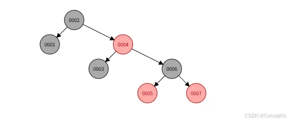 那么为了解决二叉树的缺点,我们引入了红黑树,红黑树与二叉树最大的区别就是,红黑树可以自动平衡,我们还是7个数,从1开始insert,一直到7,形成的数据结构如下:
