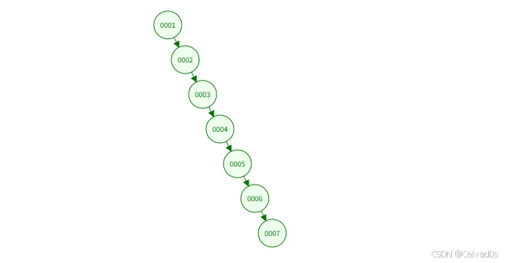 我们都知道二叉树是一个最常用最基本的数据结构,但它有一个致命缺点,就是非常容易形成链表,比如一共7个数,我从1开始insert,一直到7,就会形成如下的数据结构: