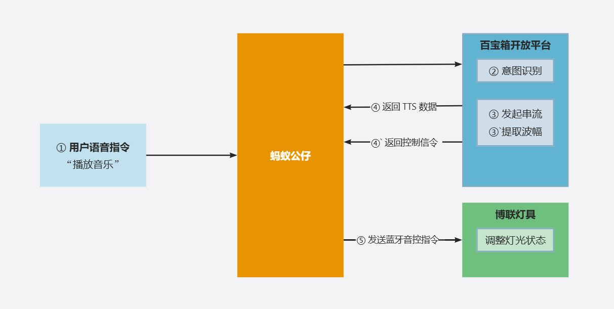 - 将 TTS 语音数据返回给蚂蚁公仔,用于语音反馈;