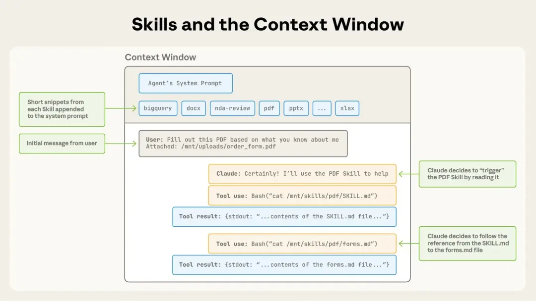 Agent Skills实现了多层次渐进式上下文加载机制,有效管理技能的发现与执行: