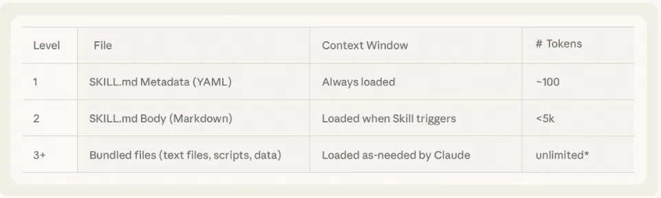 - Level 1 (Metadata): 仅加载技能元数据(名称、描述)以进行语义搜索