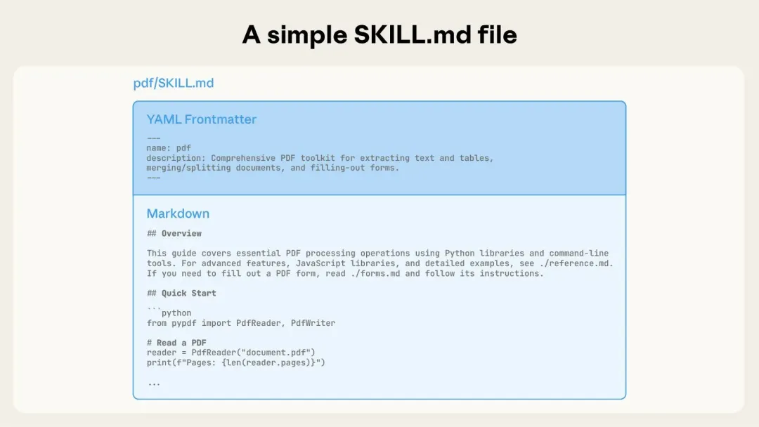 SKILL.md 文件使用YAML前置内容定义元数据,后续为详细说明的Markdown内容。