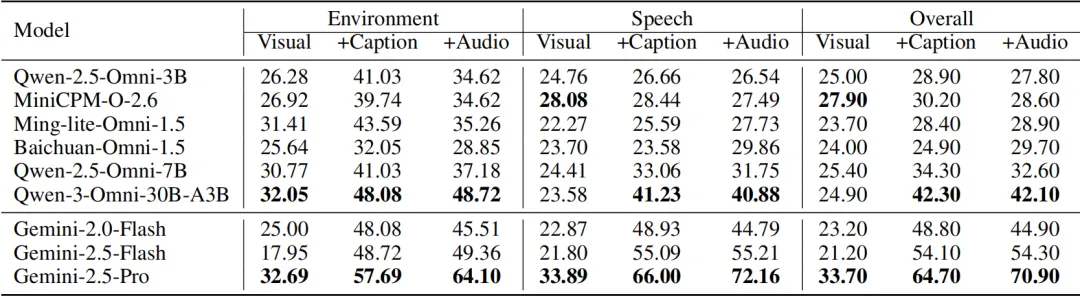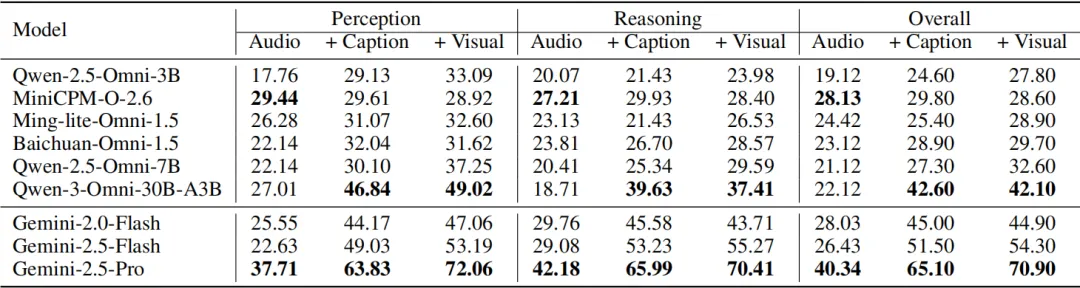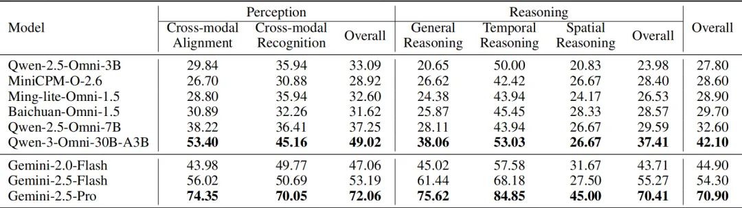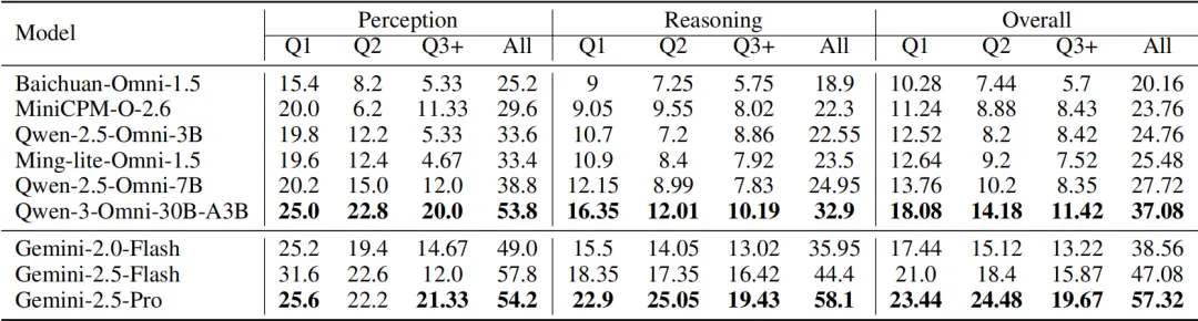 综合来看,模型的感知能力相对较强,而真正的性能差距主要体现在推理能力上。以Qwen-3-Omni-30B与Gemini-2.5-Pro为例,两者在感知能力上相差23分,但在推理能力上的差距则拉大到33分,这表明:推理能力是划分模型强弱的关键分水岭。
