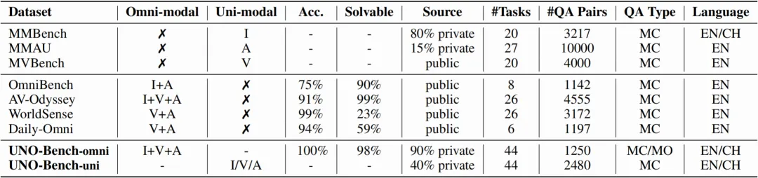 (说明: 表格中,I、A、V、T分别代表图像、音频、视频和文本模态。Acc.代表问答对的准确率,Solvable代表需要全模态才能解决的问题比例。Source代表素材来源,分为可防止数据污染的私有数据集和公开数据集。QA Type代表问答类型,MC、MO分别代表选择题和多步开放式问答。EN和ZH分别代表英文和中文。)