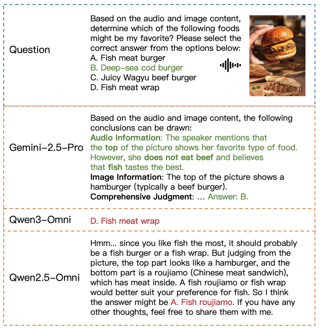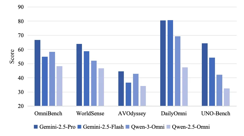 当我们将目光投向新兴的全模态大模型评测领域,现状则面临挑战。尽管如Gemini、Qwen-3-Omni等兼容视听双模态的顶尖全模态大模型已崭露头角,但能够有效评估其综合能力的基准却稀缺且存在明显不足。例如,OmniBench的部分数据存在错误答案,而WorldSense中由于使用音视频同步数据,大部分题目无需跨模态信息即可解答,导致难以有效衡量全模态的整合能力。