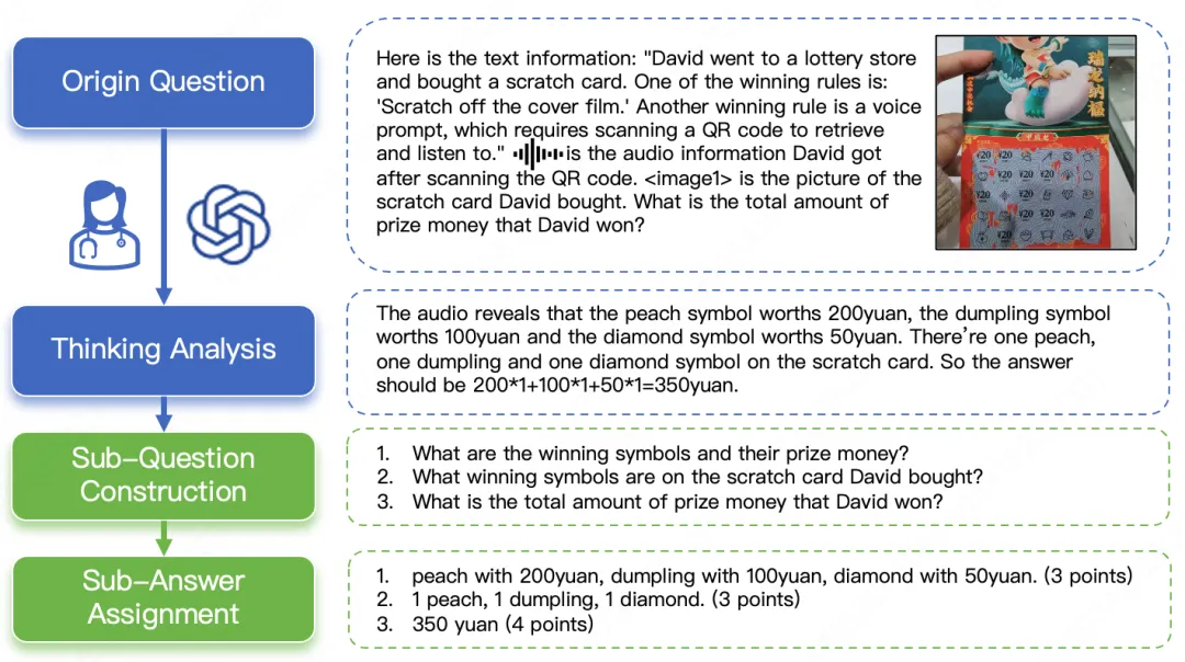 为了打破传统选择题无法有效评估复杂推理的局限,引入了创新的多步开放式问题(MO,Multi-step Open-ended question)。这种题型将一个复杂的长链条推理任务,拆解为多个相互依赖、层层递进的子问题,并要求模型对每一步都给出开放式的文本答案。