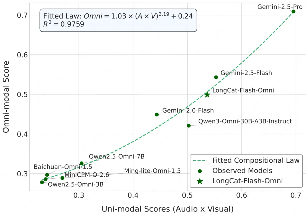 从图10的具体模型分布来看,其中参与拟合的模型由圆点表示,新增的LongCat-Flash-Omni模型表现较为突出。虽然Gemini系列的具体参数规模未知,但可以观测到LongCat-Flash-Omni的表现已非常接近Gemini-2.5-Flash,并显著领先于Qwen3-Omni-30B。其位置正处于曲线加速上升的“协同增益区”,且与理论拟合曲线高度吻合,这表明该模型展现出了高效的多模态融合能力。