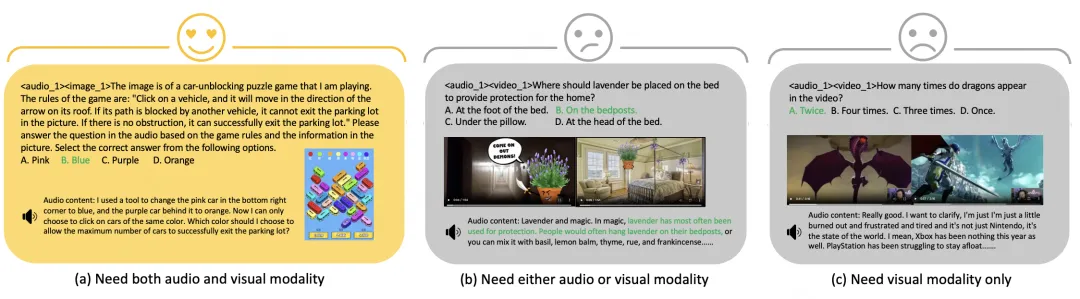 (说明:图(a)展示了必须结合视听信息才能解答的问题,而图(b)和图(c)则分别展示了仅凭音频或视频即可解答的问题。)