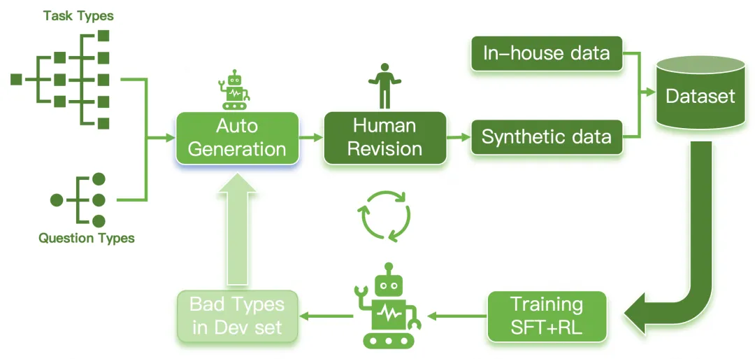为实现自动化评估,LongCat团队还提出了一个通用评分模型,通过对问题类型进行细分(如图7所示),并结合人工和自动标注多轮质量迭代的数据集(如图6所示),使其能够支持6种通用问题类型的自动评分,在分布外的模型和基准测试中达到了95%的准确率。