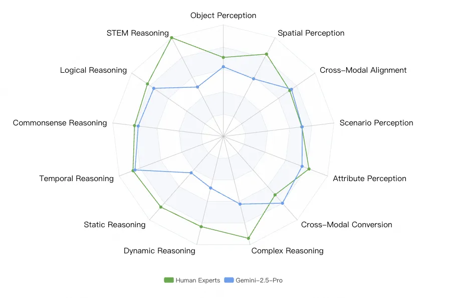 说明: Gemini-2.5-Pro在感知能力上与人类相当,但在推理能力上仍有差距。