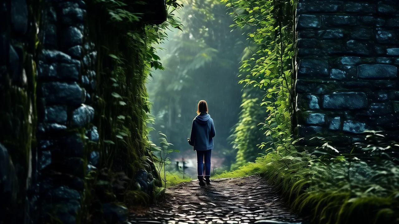 生成的文案:幽深的森林小径蜿蜒穿过茂密的树影,青苔覆盖的石板上残留着昨夜的露水。一位旅人手持老旧手机,神情专注地查看屏幕,仿佛在寻找某种指引。远处,一座古老的城堡矗立在薄雾中,尖顶刺破灰蓝色的天空,墙壁爬满藤蔓,散发着神秘与沧桑的气息。阳光透过树叶洒下斑驳光影,营造出一种静谧而略带忧郁的氛围。
