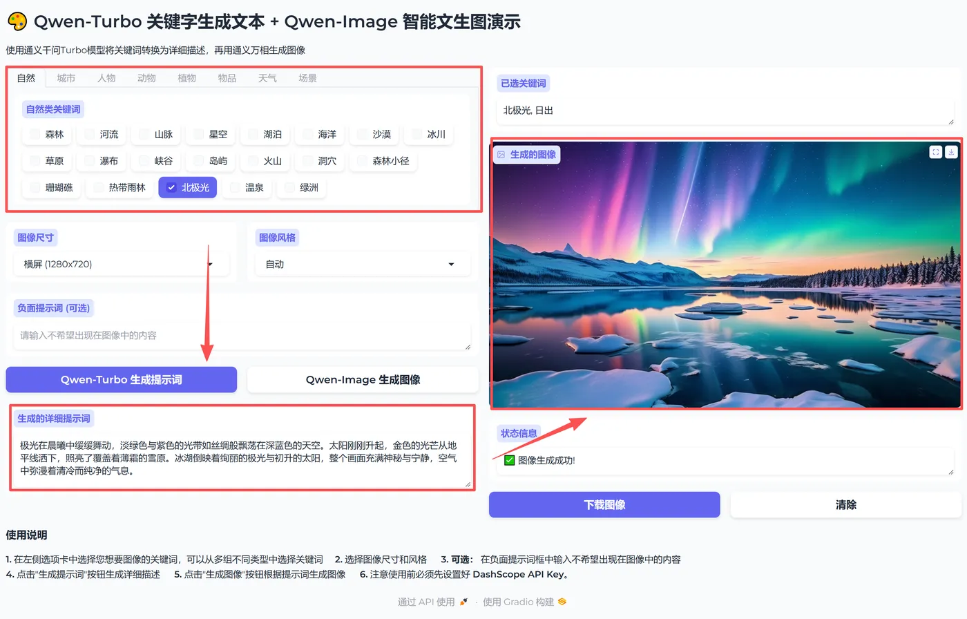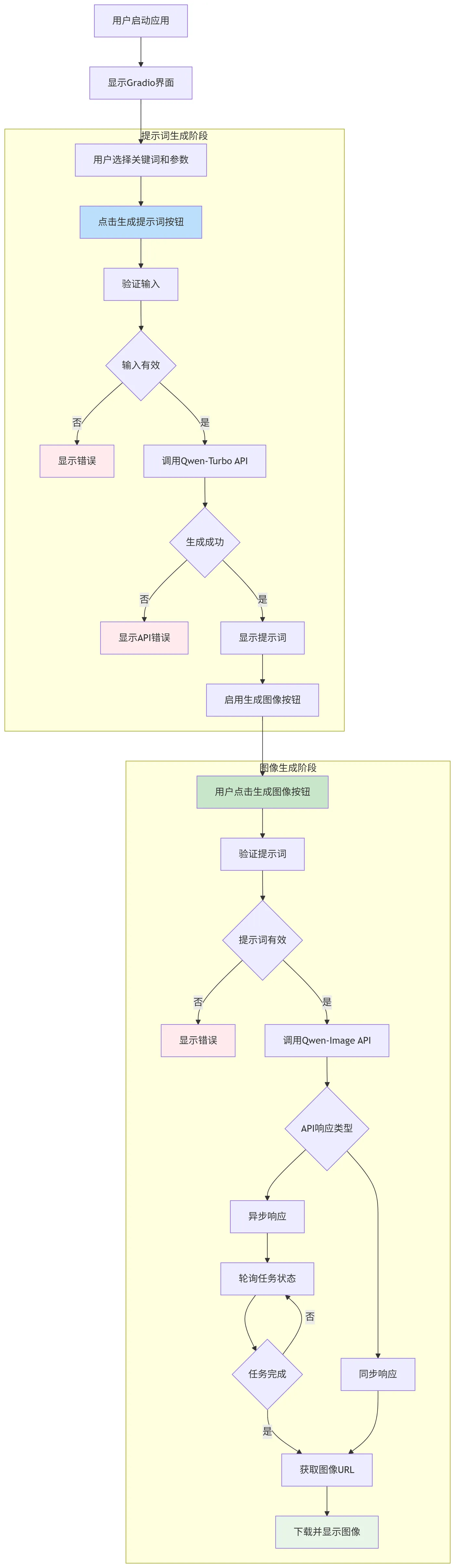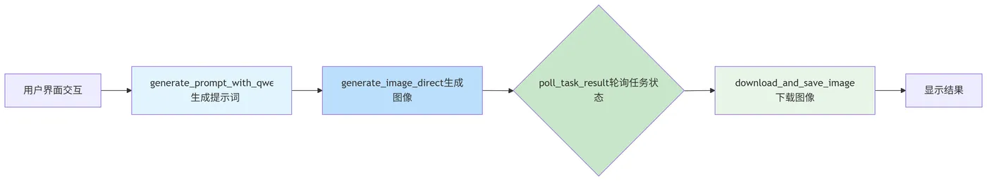 4. 生成图像:只有在提示词生成后才可点击,调用Qwen-Image生成图像并显示。