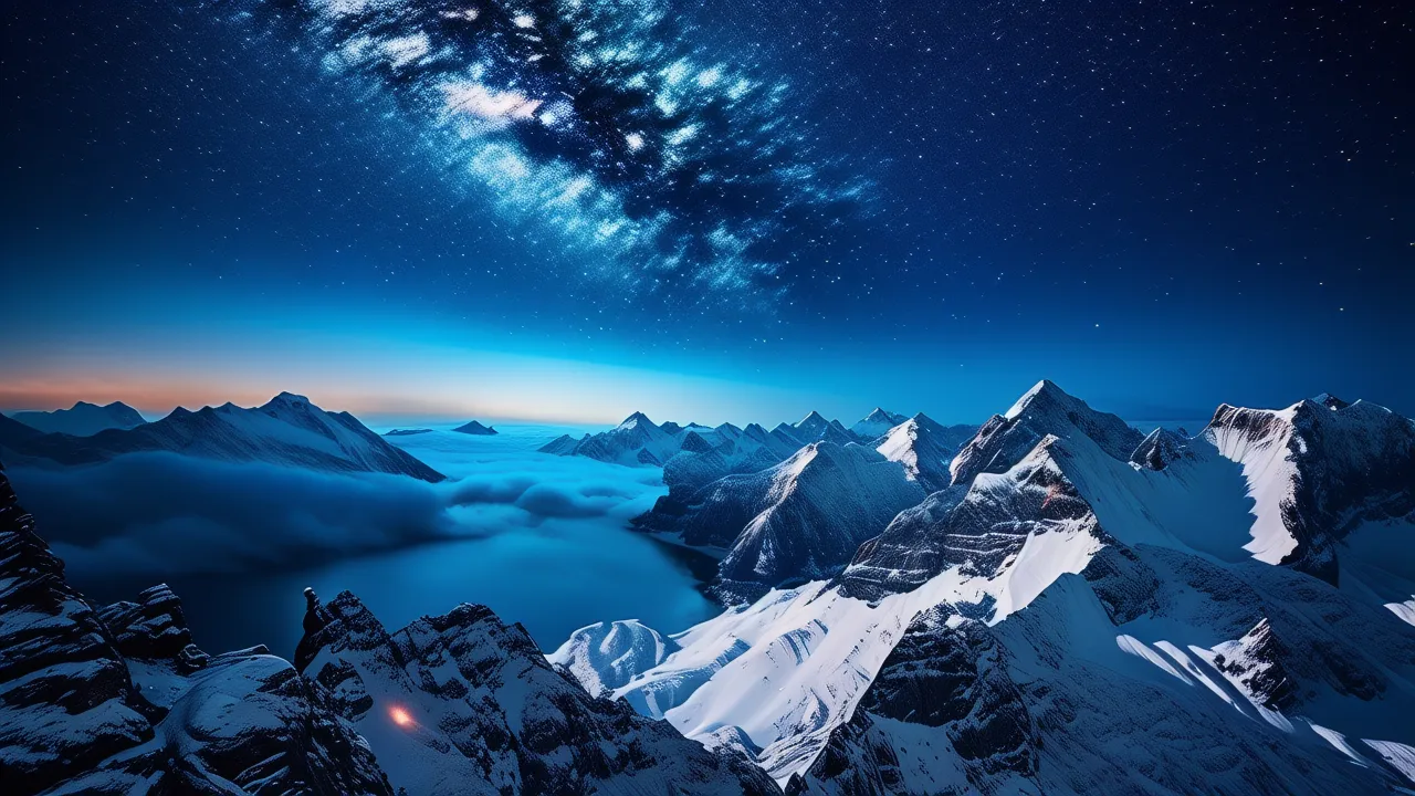 生成的文案:摄影师伫立在巍峨的山脉之巅,夜空如墨,繁星点点,银河横跨天际,璀璨夺目。他专注地调整着相机参数,镜头对准那片神秘的星空,脸上带着沉静而兴奋的神情。四周寂静无声,只有微风轻拂山岩,月光洒落在雪峰之上,银白与深蓝交织,营造出宁静而壮丽的氛围。