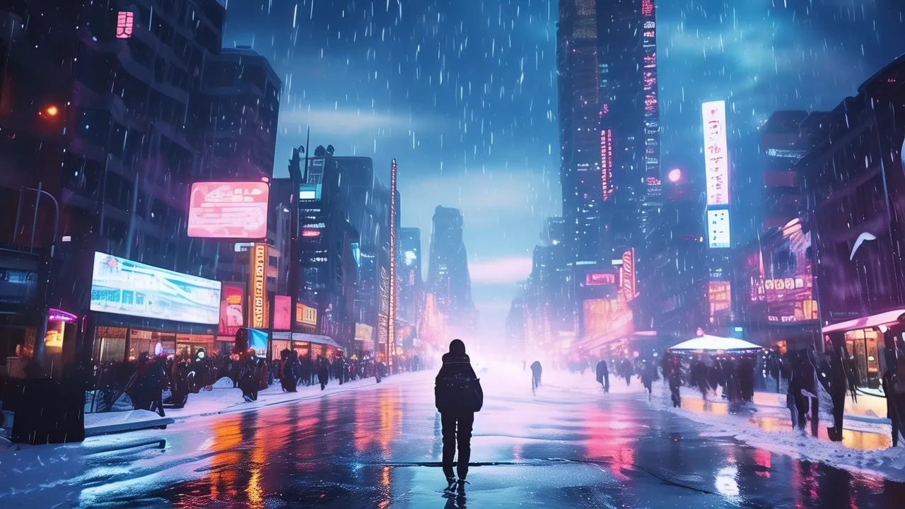 生成的文案:高楼在暴雪中闪烁着冷艳的霓虹光芒,赛博朋克风格的灯光在白色雪花中投下斑斓的光影。街道上行人稀少,穿着厚重羽绒服的影子在闪烁的广告屏下匆匆而过。巨大的全息投影在空中浮现,模糊的数字代码在风雪中若隐若现,整个城市仿佛被冻结在未来的梦境之中。