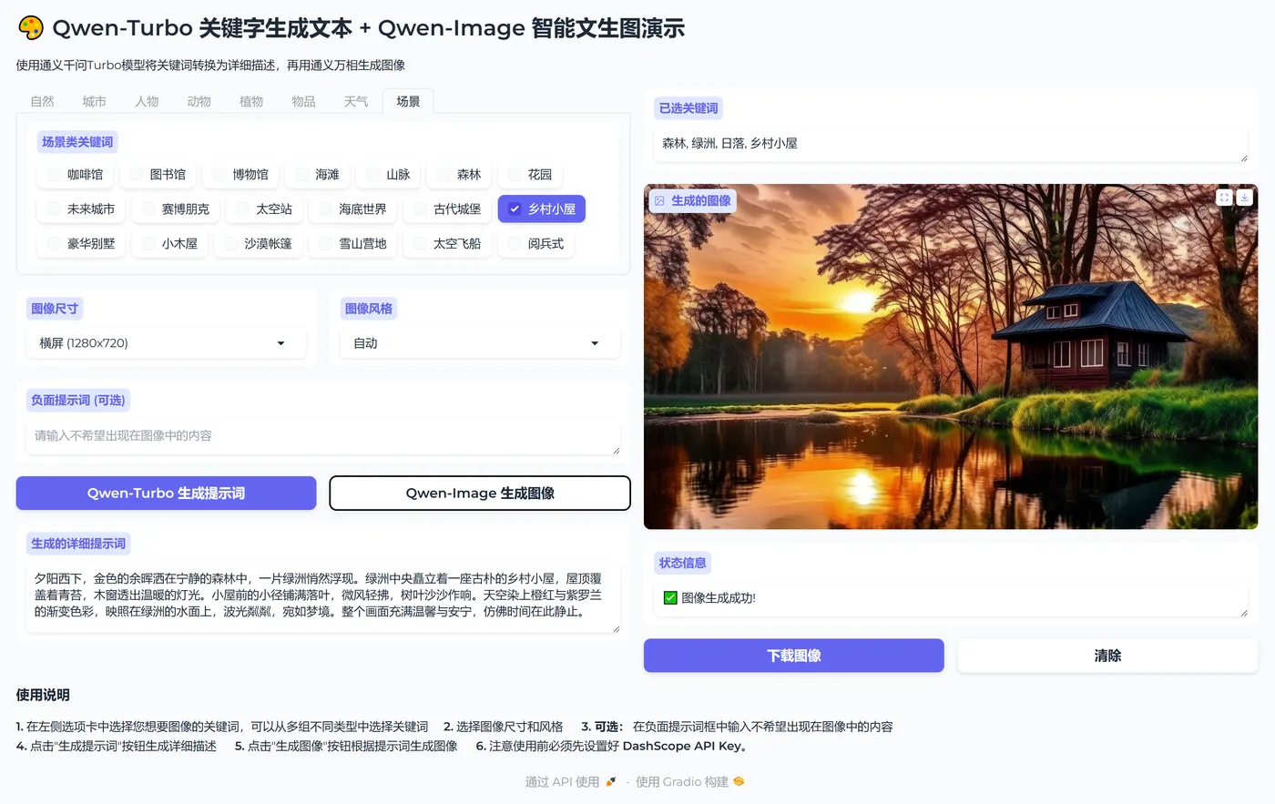 - 使用Qwen-Turbo模型根据用户选择的关键词生成详细的图像描述