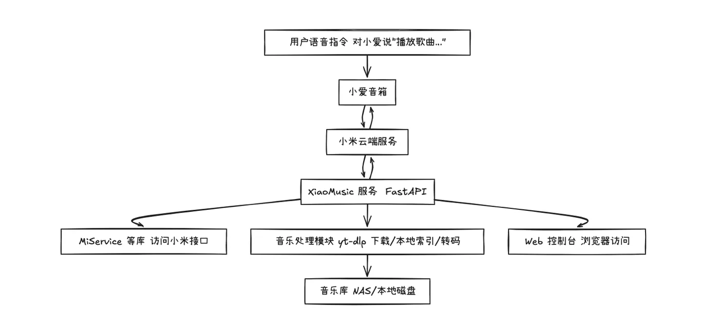 XiaoMusic 借鉴了社区对小爱音箱的通用方案:通过 MiService 等库获取小爱对话记录,并调用小米 TTS/控制接口,将下载好的音频推送到音箱播放。