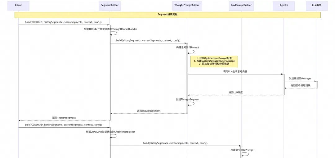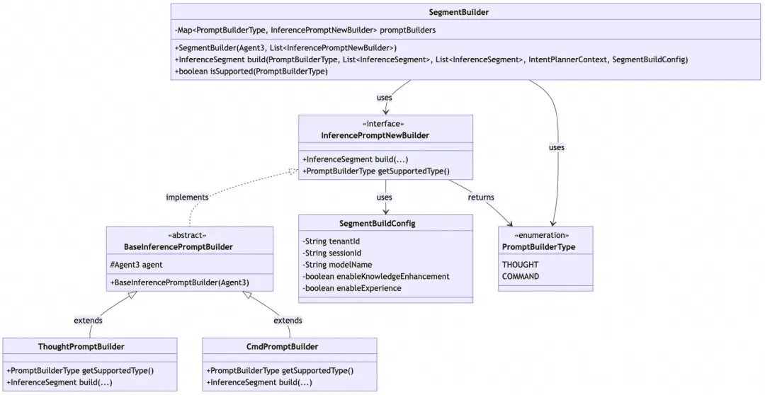 IntentPlanner ├── SegmentBuilder (成员变量) │ ├── List<InferencePromptNewBuilder> promptBuilders │ ├── InferencePromptConfigManager (prompt配置管理) │ ├── build(type, segments, context, config) -> InferenceSegment │ └── 路由到具体的PromptBuilder │ └── PromptBuilder实现类 ├── BaseInferencePromptBuilder (抽象父类) │ └── 使用InferencePromptConfigManager获取配置化prompt ├── ThoughtPromptBuilder ├── CmdPromptBuilder └── 其他自定义PromptBuilder