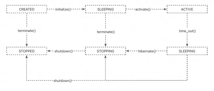 在我们的系统中,一个Agent是一个线程。在Agent运行过程中,将会在线程池中,同时运行各个Area和Act。其生命周期如下图所示:
