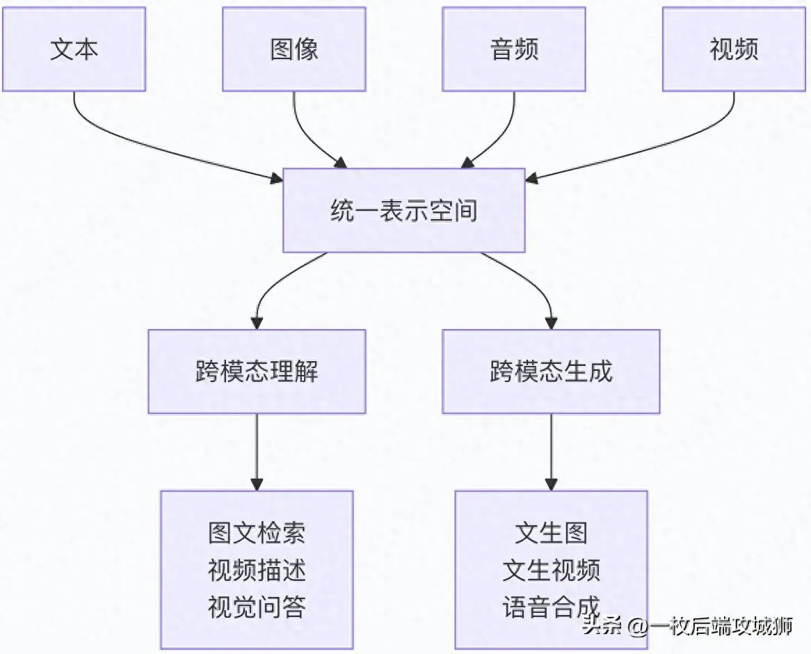 # 多模态模型架构的演进 multimodal_evolution = { "早期方法": { "技术": "分别处理各模态,后期融合", "例子": "分别提取图像和文本特征,然后拼接", "缺点": "缺乏深层交互,理解有限" }, "中期方法": { "技术": "跨模态注意力机制", "例子": "CLIP, ViLBERT", "优点": "模态间交互,理解更深" }, "现代方法": { "技术": "统一编码器,任意模态输入输出", "例子": "GPT-4V, DALL-E 3, Sora", "优点": "无缝跨模态,端到端学习" } }
