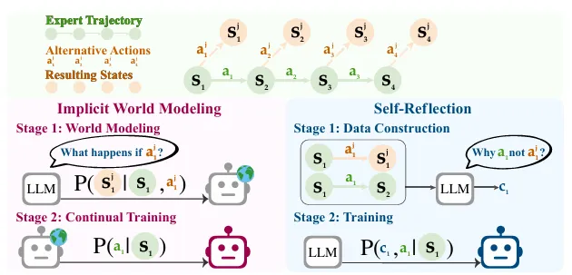隐式世界建模(IWM):智能体模拟「如果这样做会发生什么」,通过预测动作导致的状态变化,内化环境因果规律。