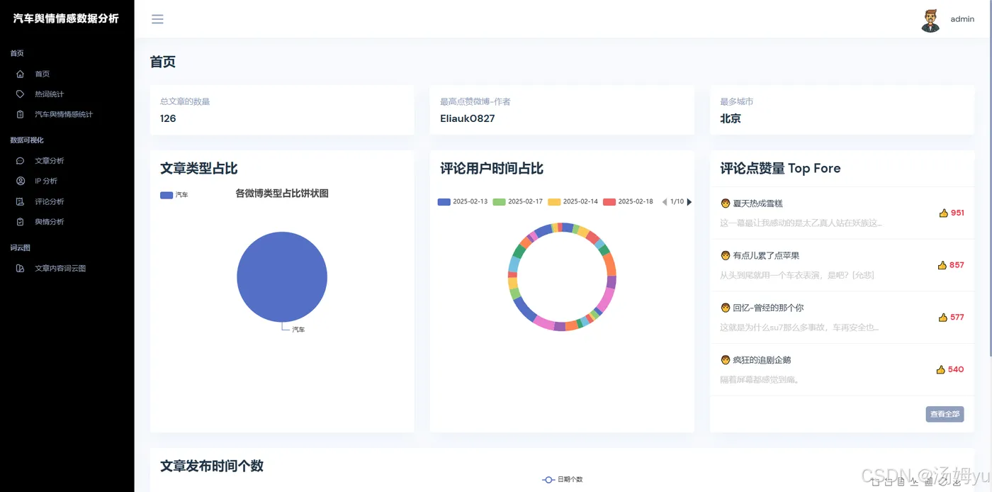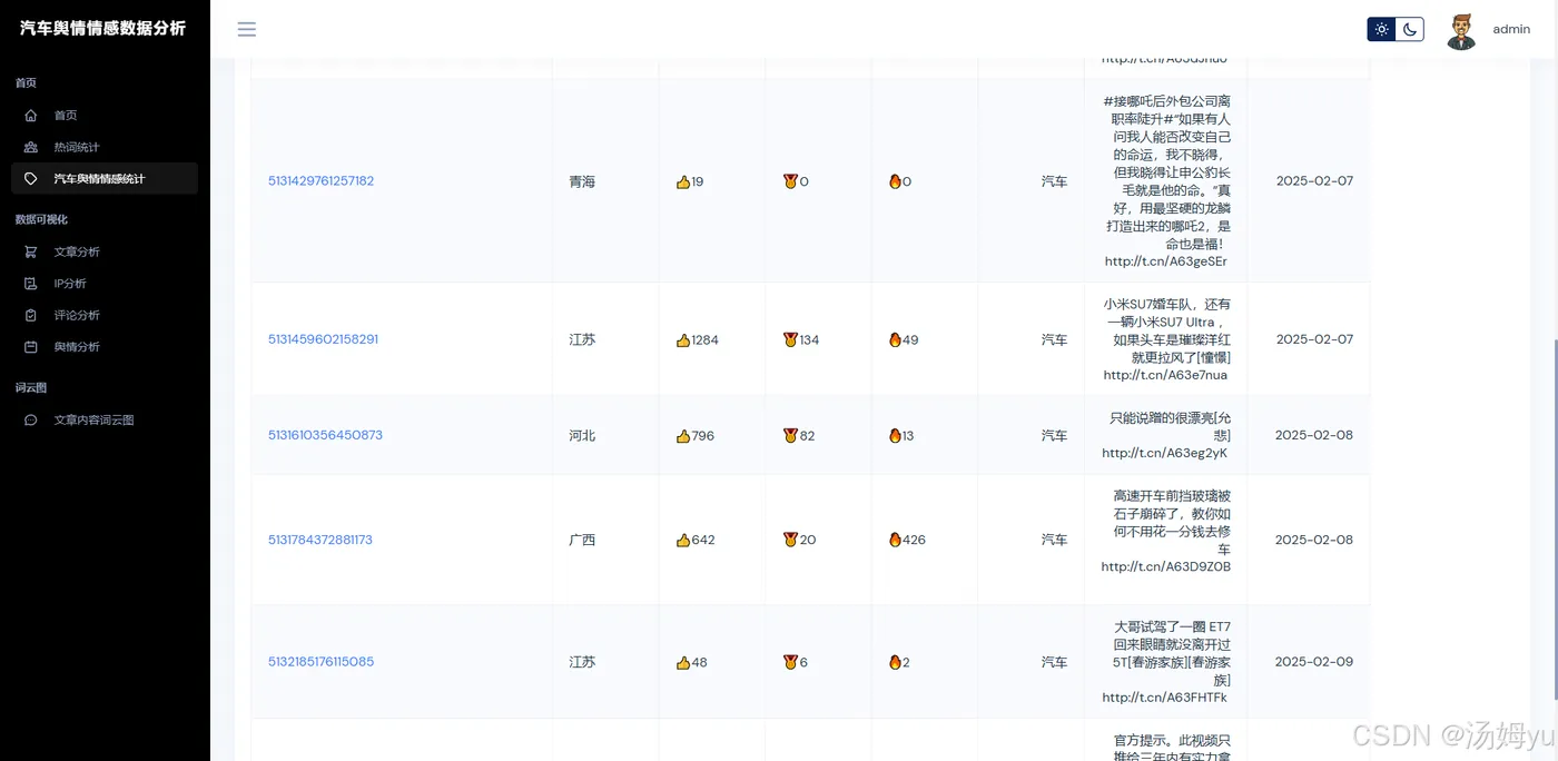 汽车舆情分析与监测平台项目旨在结合汽车分析和舆情分析与监测系统的技术,为用户提供更精准、个性化的信息服务。该项目的背景源于对用户需求个性化、社交关系影响力的认识,以及对信息传播、产品推广等方面的需求。随着互联网的快速发展,人们在汽车平台上产生了大量的信息[1],用户面临着信息过载和推荐困境。传统的推荐系统虽然可以根据用户历史行为进行推荐,但往往无法充分考虑用户的社交关系、兴趣变化和影响力因素,导致推荐结果缺乏个性化和精准度。因此,结合汽车舆情分析与监测系统的技术,可以更好地挖掘用户的潜在需求、社交影响和信息传播规律,为用户提供更符合其实际需求的推荐服务。汽车舆情分析与监测平台项目的背景源于当今汽车蓬勃发展的大环境。随着互联网的迅猛发展,汽车平台成为人们获取信息、交流观点、分享生活的重要场所,用户在其中产生了海量的数据和行为。然而,这些数据的涌入也带来了信息过载和推荐困境的问题:用户面临着海量信息中寻找符合自身兴趣的困难,传统的推荐系统往往无法充分考虑到用户的社交关系、兴趣变化和影响力因素,导致推荐结果缺乏个性化和精准度。在这一背景下,结合汽车舆情分析与监测系统的技术应运而生。该项目旨在通过对用户在汽车上的行为、社交关系[2]、内容传播等多方面数据进行深度分析和挖掘,实现舆情分析与监测、社交影响力评估和信息传播监测,为用户、内容创作者和商业机构提供更智能、精准的信息服务和营销支持。此外,随着市场需求对舆情分析与监测和社交影响力分析提出更高的要求,该项目也立足于满足市场的需求,为汽车信息传播、用户体验、商业推广等领域带来新的机遇和变革。