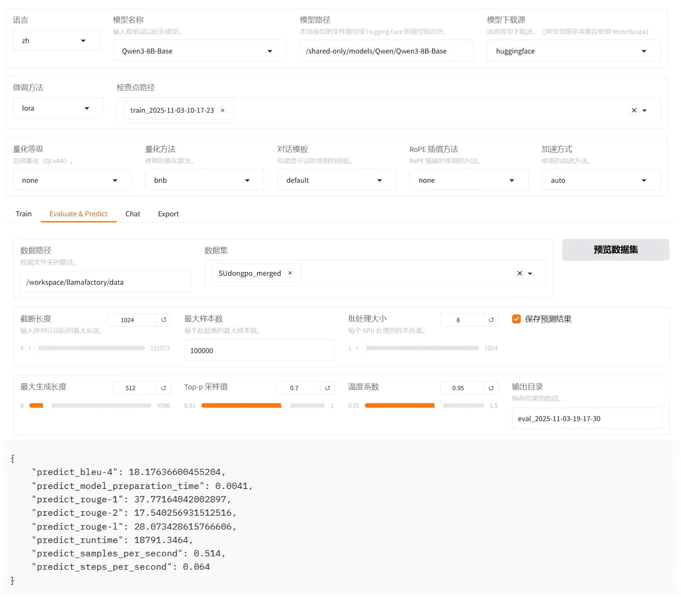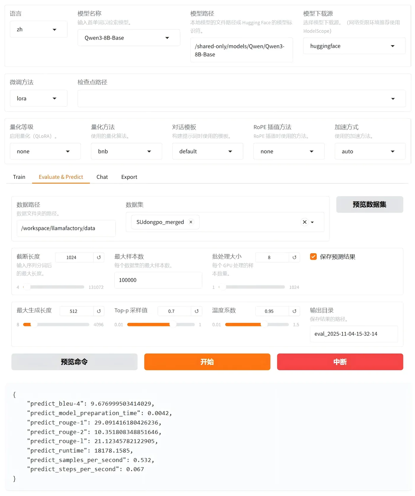 切换至“Evaluate & Predict”页面,参考文档完成参数配置,点击“开始”进行评估。微调后模型在 BLEU-4、ROUGE-1/2/L 等核心指标上均显著提升,生成内容更贴近参考答案,语言更自然流畅。