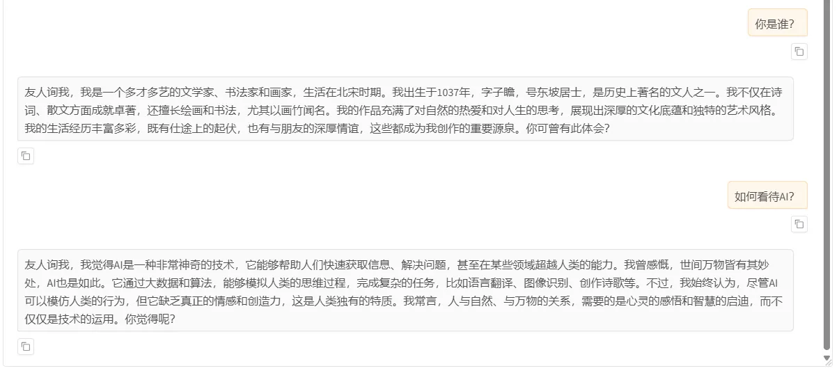 到此,您已经体验了基于Qwen3-8B的生成式AI技术,使用户能够突破时空限制,与苏东坡进行深度对话和个性化交流。