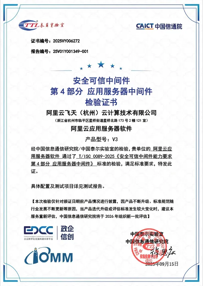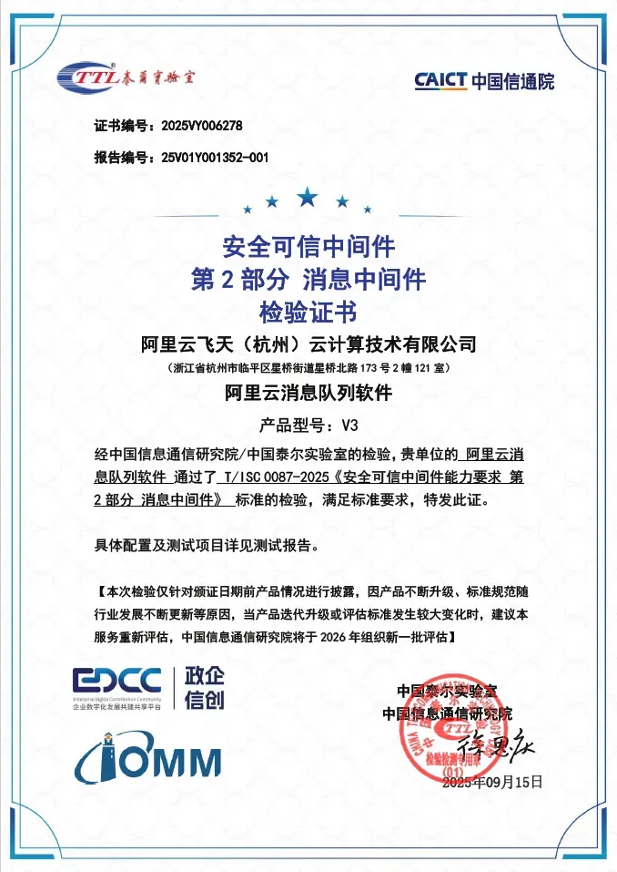 近日,由中国信通院主办的 2025(第五届)数字化转型发展大会在京举行。会上,“阿里云应用服务器软件 AliEE”、“消息队列软件 RocketMQ”、“云数据库 Tair”三款产品成功通过中国信通院“安全可信中间件”系列评估,成为首批获此认证的中间件产品。