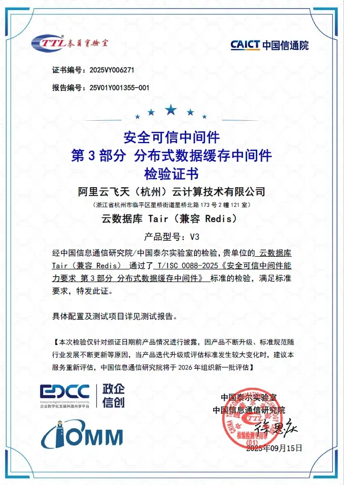 阿里云以 AliEE、RocketMQ、Tair 为核心的安全可信中间件产品矩阵,通过中国信通院评估认证,不仅验证了产品在多架构与安全领域的卓越能力,更为政企用户提供高可用、高性能、高安全的数字化转型底座。