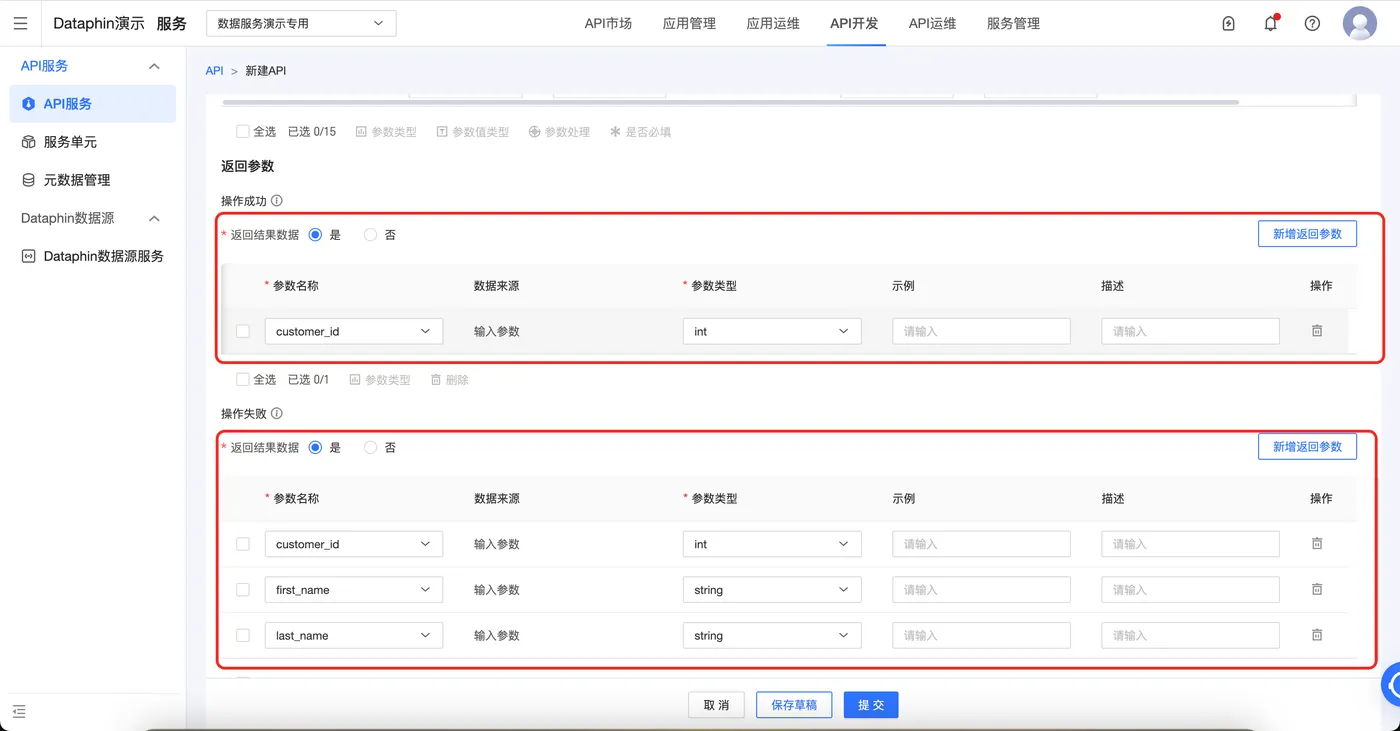 2)在返回参数中,可分别配置操作成功时返回的数据和操作失败时返回的数据。一般来说成功操作时,仅可返回主键或者无需返回,而失败时,则需要返回更完整的信息用于定位。比如在失败结果中,我们可以配置输入的参数,而在成功的结果中也配置customer_id(如数据库为PostgreSQL,也可将returning中的字段配置为成功结果的返回值)。