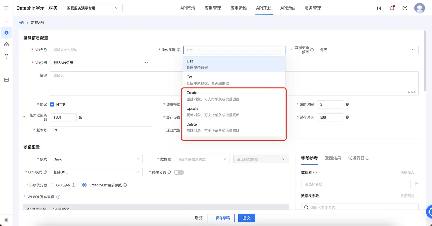 升级到Dataphin 5.4后,可以发现API的操作类型新增了Create、Update和Delete(如未出现,则需要购买及开通数据增强操作模块)。