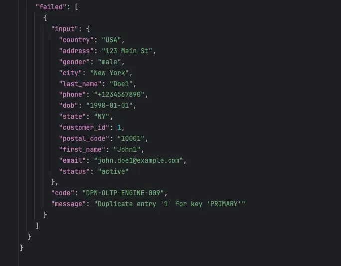 例如,当遇到主键冲突时,插入失败的数据记录将被返回: