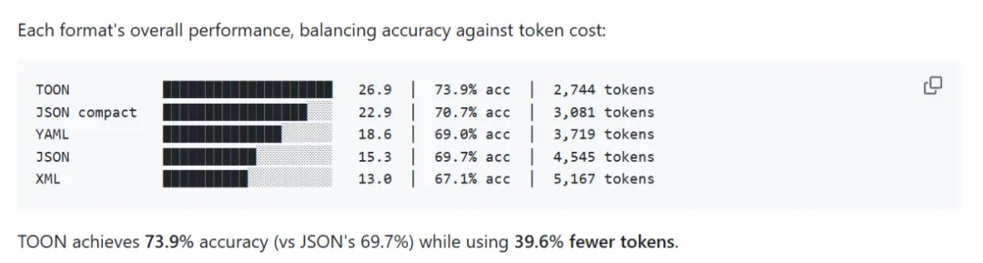 所以TOON并不是什么颠覆性的东西。更像是有人把 JSON 里那些多余的部分清理掉,然后说:跟模型交互的时候,可以试试这个。