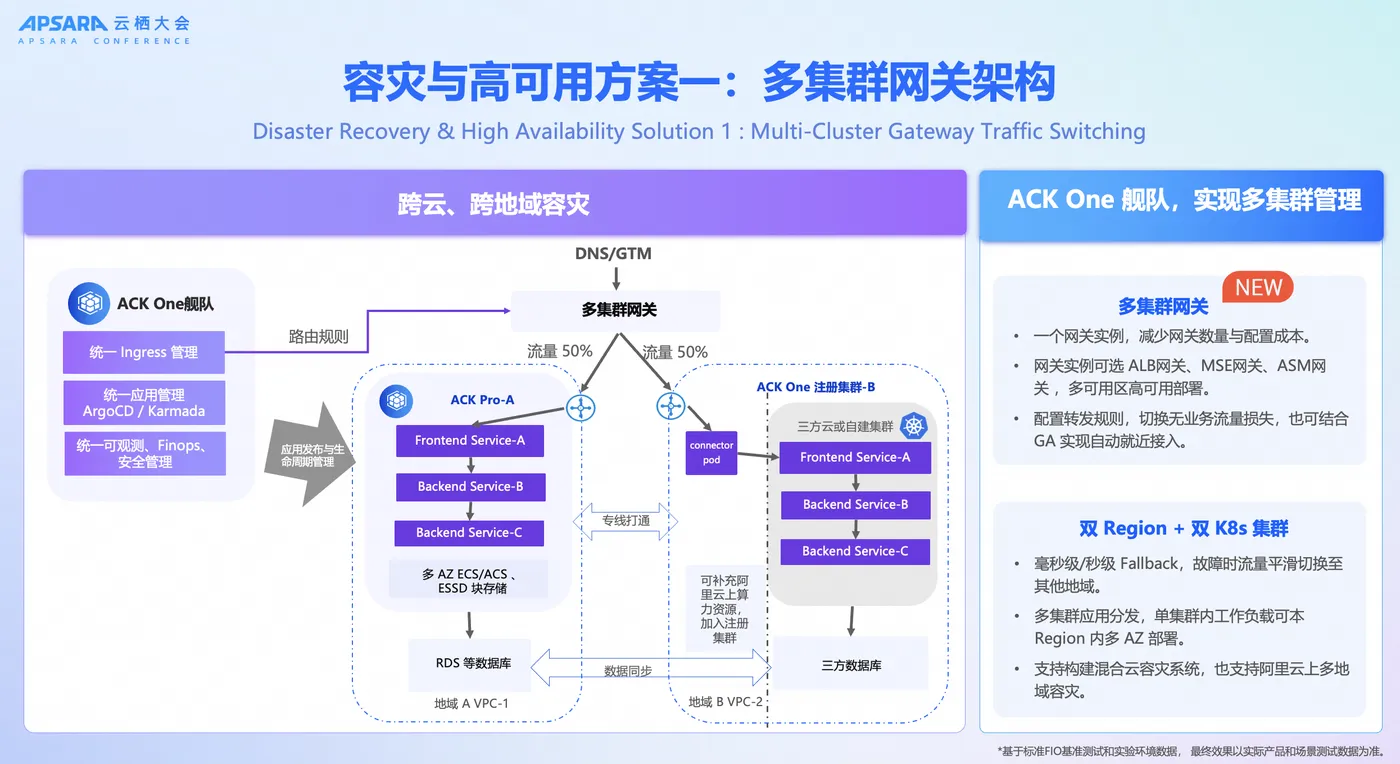 在混合云双 K8s 集群的对等部署场景下,ACK One 提供成熟的集群维度双活容灾方案。其核心在于多集群网关。