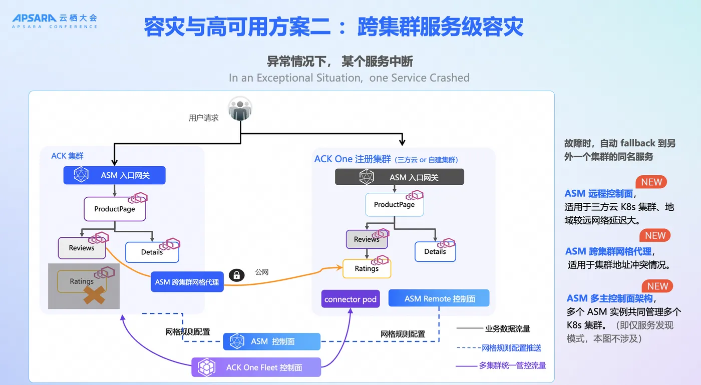 当故障仅限于集群内某个特定服务时,Service 维度容灾策略能提供更精细的防护。这正是 Istio 服务网格发挥其核心价值的场景。 服务网格ASM支持打通多个集群的服务发现以及网络互访,结合多地域、多集群的服务对等部署模式,在任意的服务发生故障时,只要集群中还存在可用的服务工作负载实例,服务网格 ASM(Service Mesh)都可以秒级对流量目标实现无感切换,保证业务应用在全局的可用性。具体可以参看文档: https://mp.weixin.qq.com/s/aUaCgU-YTyq_300kRxMo7A