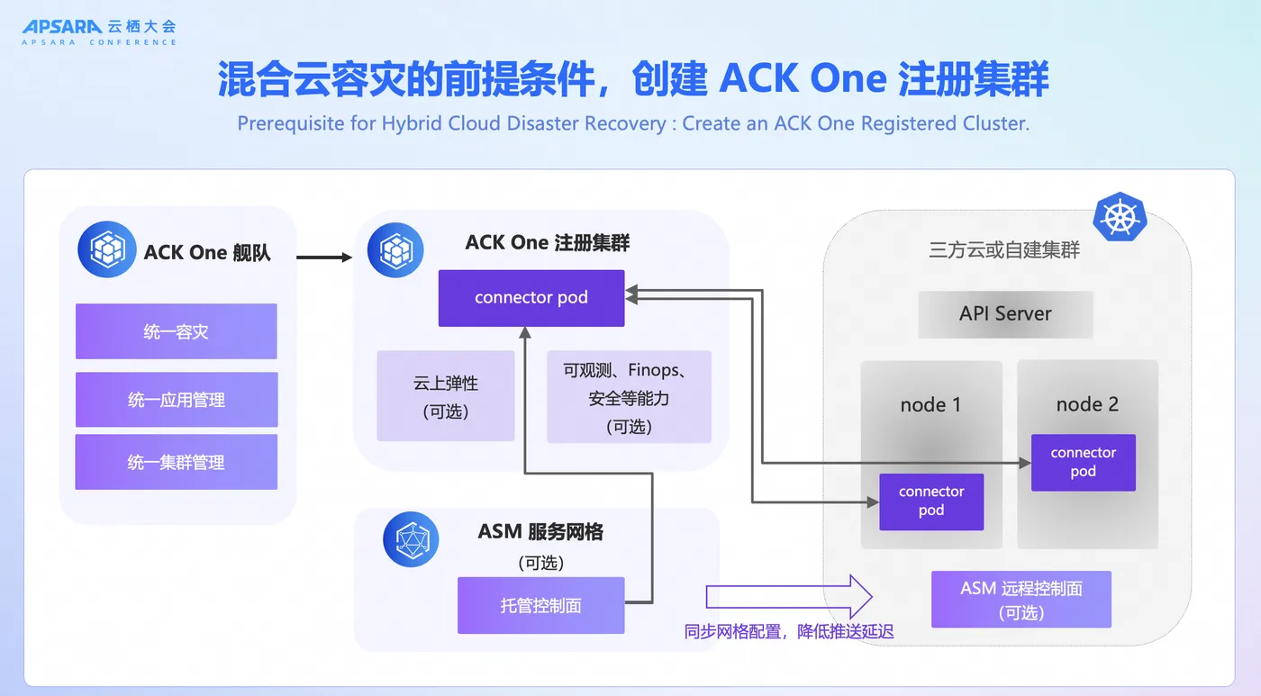 面对混合云部署场景,非阿里云 K8s 集群如何融入统一容灾体系?核心在于将其注册为 ACK One 注册集群。通过在目标集群部署多副本 connector pod,ACK One 得以建立安全通信通道。注册后,这些集群不仅能补充获得ECS/ACS 算力、可观测性/FinOps 及安全等阿里云能力,而且还能作为子集群被 ACK One 舰队统一管理。