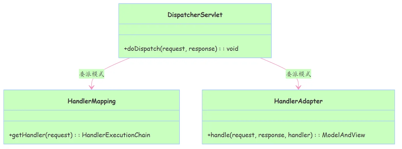从类图可以看出,DispatcherServlet 与 HandlerMapping、HandlerAdapter 之间是典型的依赖关系,且这种依赖完全服务于“任务委派”这一目的。