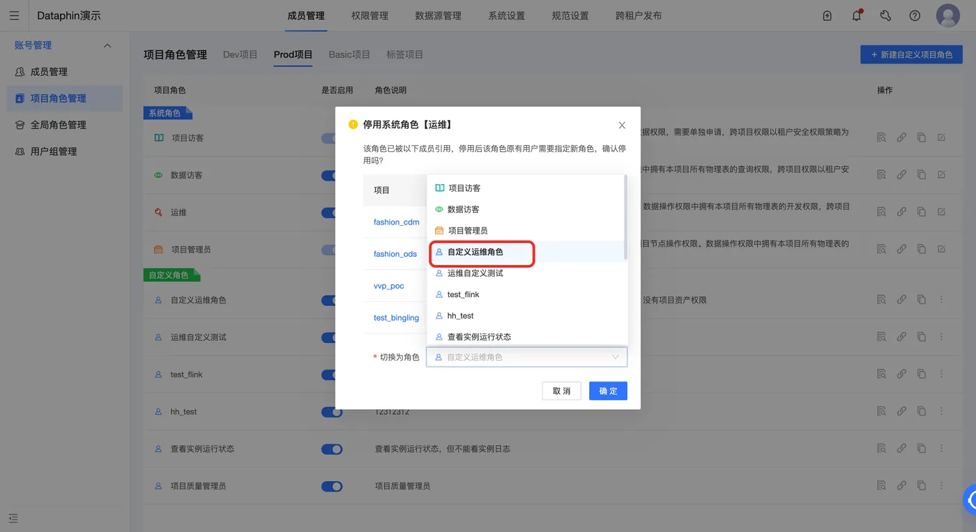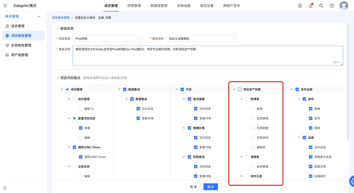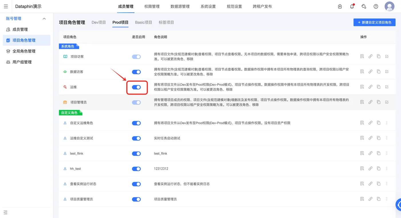 在上述场景中,管理员希望为【运维】角色去除有关生产表的操作权限,包括查询、修改、删除等,这一需求可以通过自定义项目角色完成,具体操作流程如下: