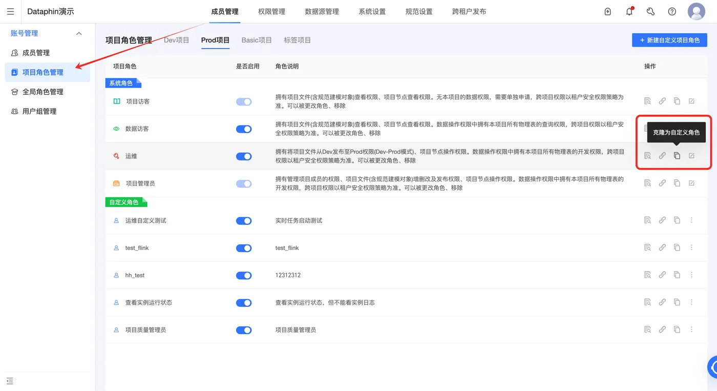 - 在「管理中心」-「成员管理」-「项目角色管理」中,找到「Prod项目」-「系统角色」-「运维」,点击克隆。