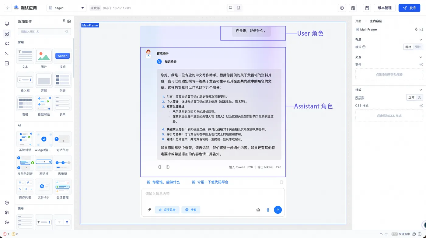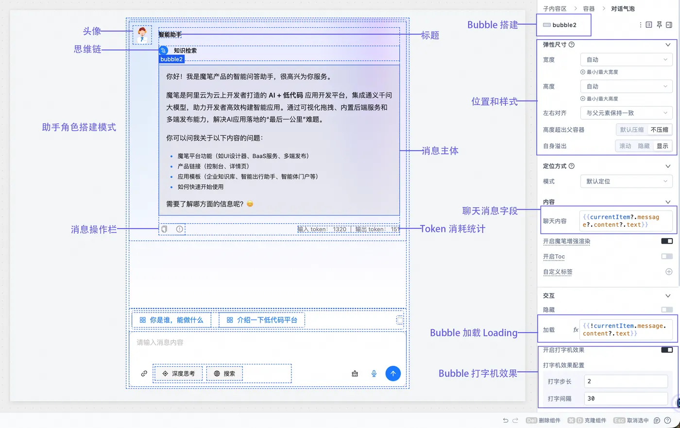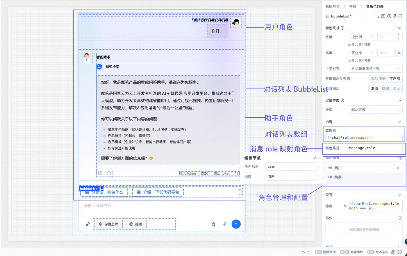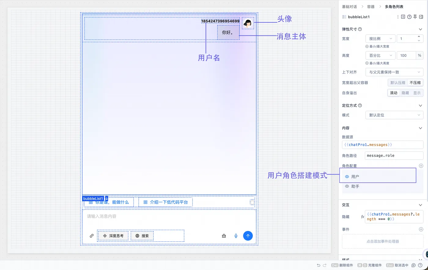 在对话列表区中,Chat Builder 支持灵活的多角色搭建,可使用多角色列表(BubbleList)组件,对不同角色的消息内容区进行可视化设计与布局。