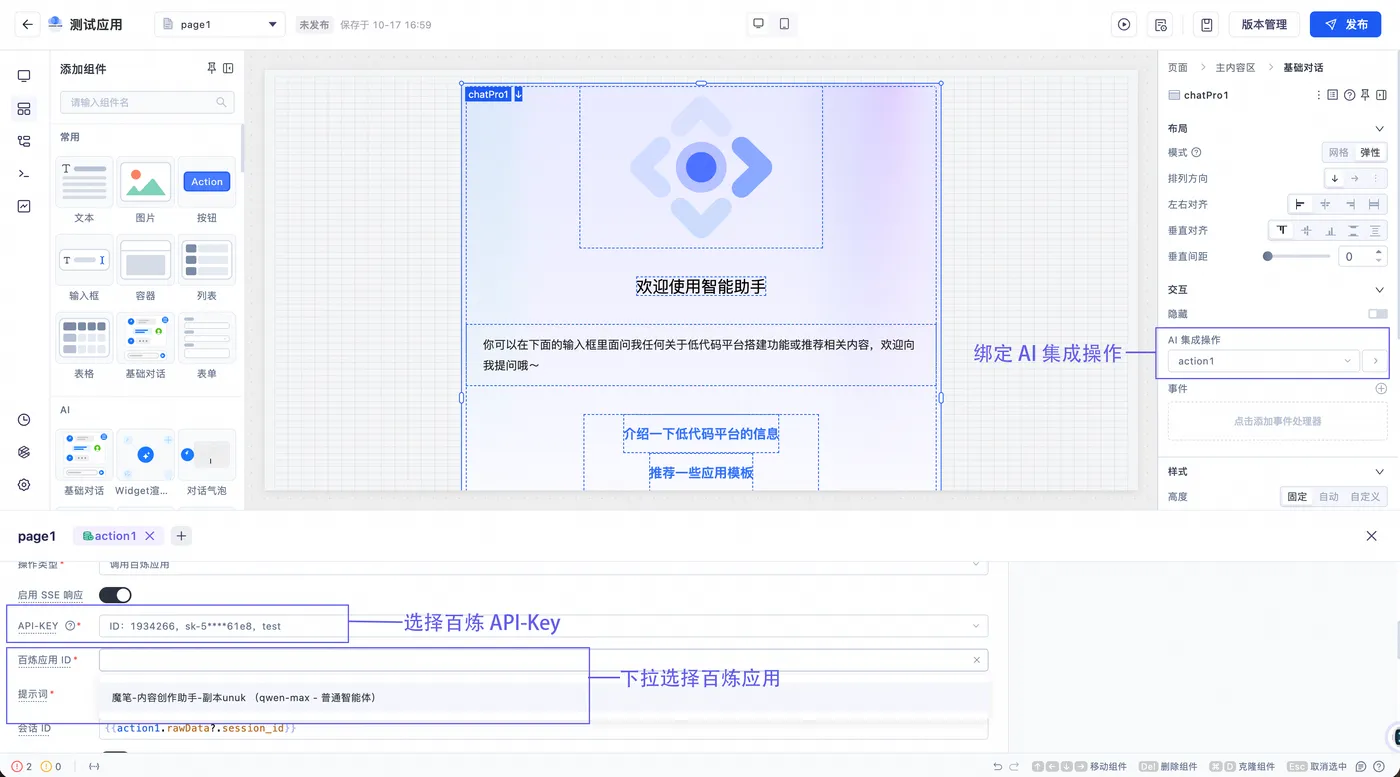 基础对话(ChatPro)组件可通过配置 AI 集成操作,直接访问阿里云百炼大模型和智能体应用服务。