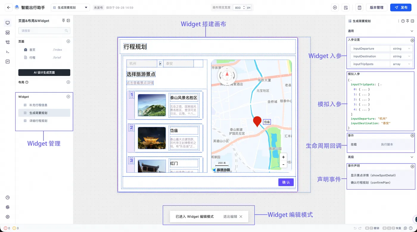- 入参设置与调试,Widget 动态消费外部数据进行渲染,可自由定义输入参数,搭建时可配置模拟入参,在没有真实数据传入时也能实现实时预览与调试