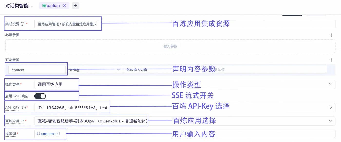 当选择阿里云百炼应用集成资源时,会显示适配的专属配置项,例如: