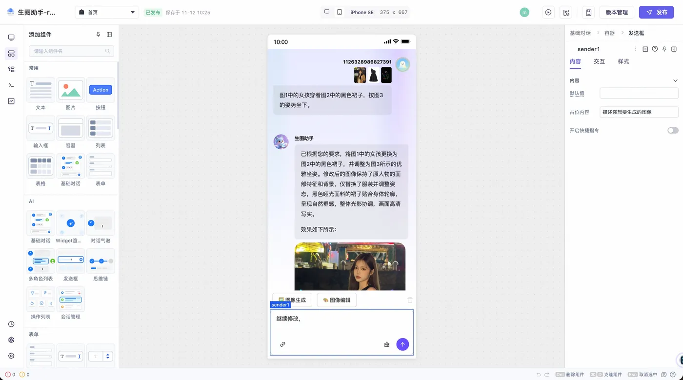 设计器内置可直接使用的 Chat 组件,将基础对话组件拖入画布后,即可自动加载核心对话功能: